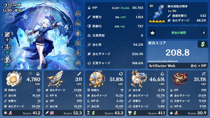 - フリーナはHPは3万越えれたら大丈夫です。基本HPよりかは爆発によるバフがメインになりますので元チャを盛りながら率ダメを安定させてHPを盛るのが良いです。基本的なステータスはHP3万率70~80会心ダメ120~140、元チャ160~180を基本として盛るのがおすすめです。